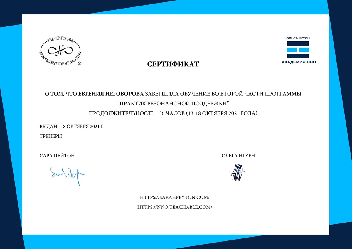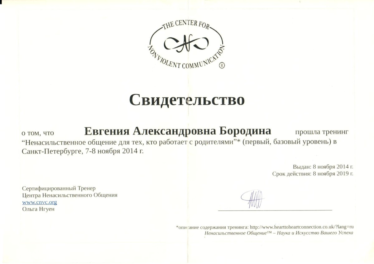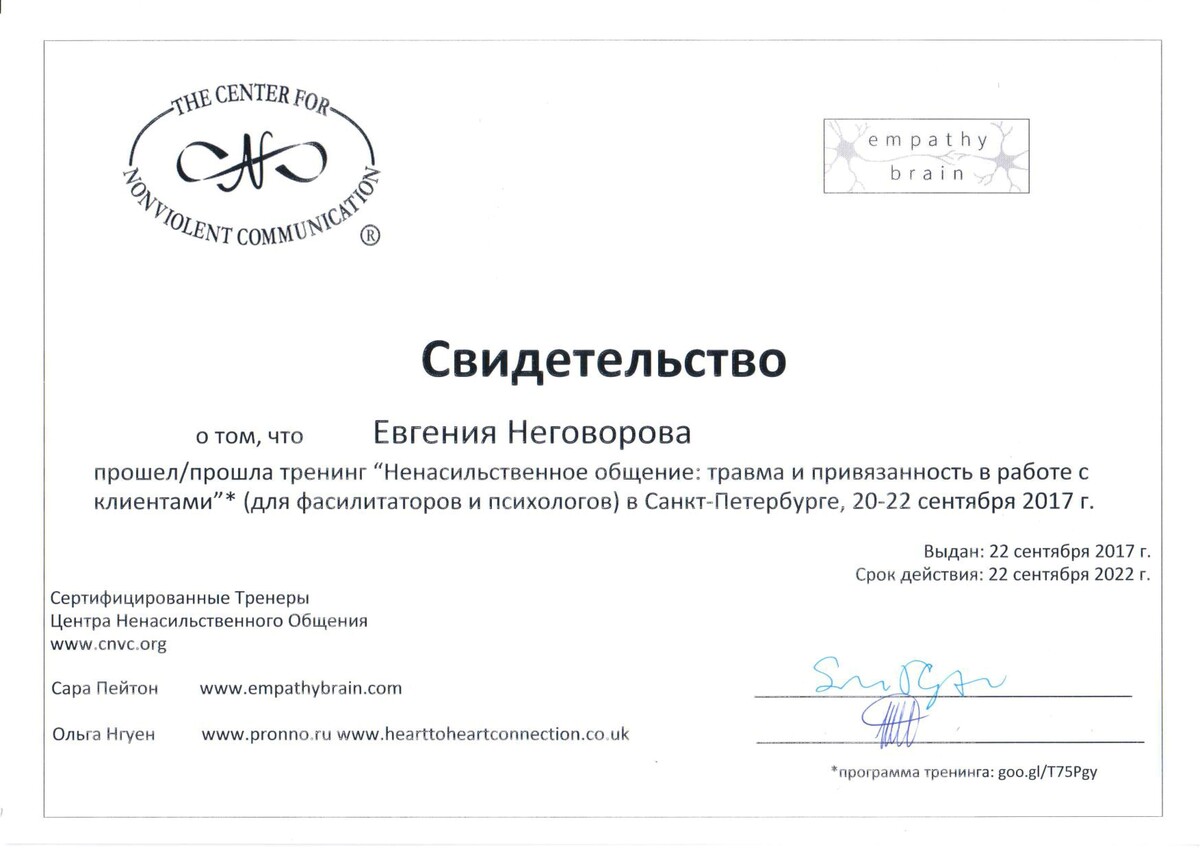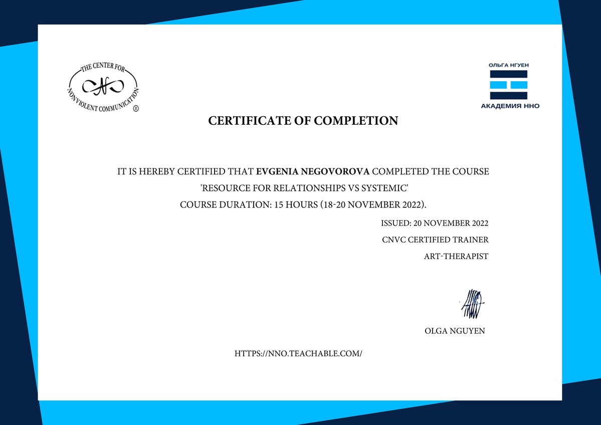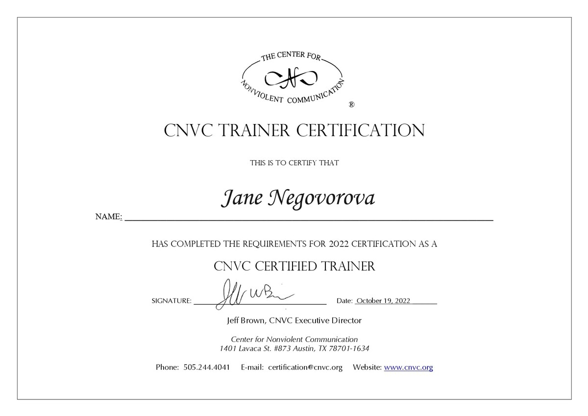 - Сертифицированный тренер по Ненасильственному общению, CNVC;