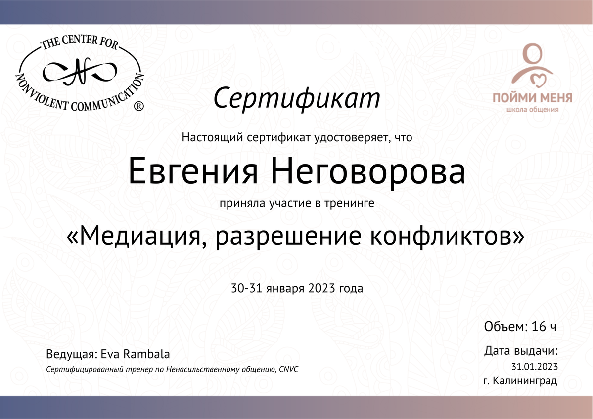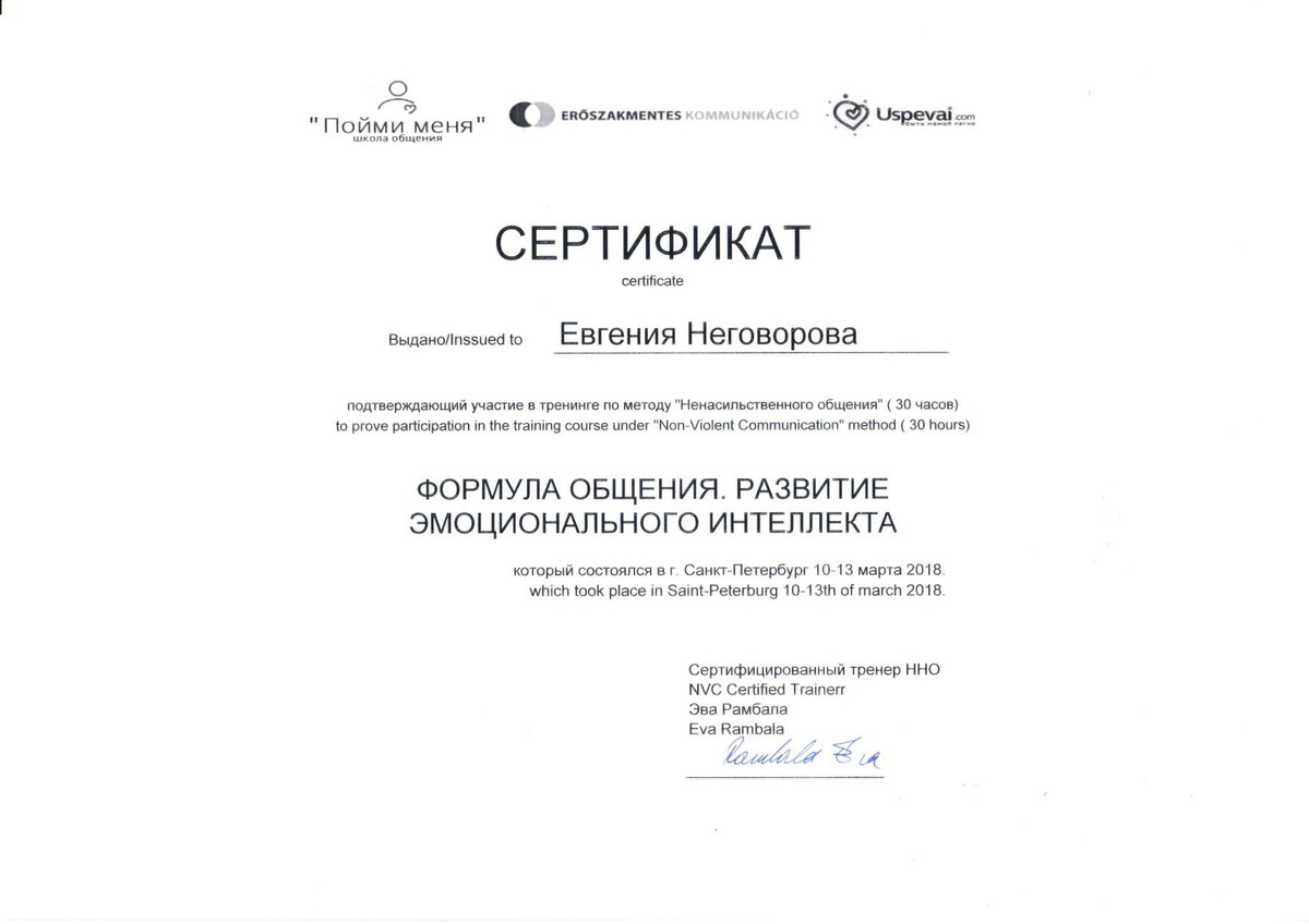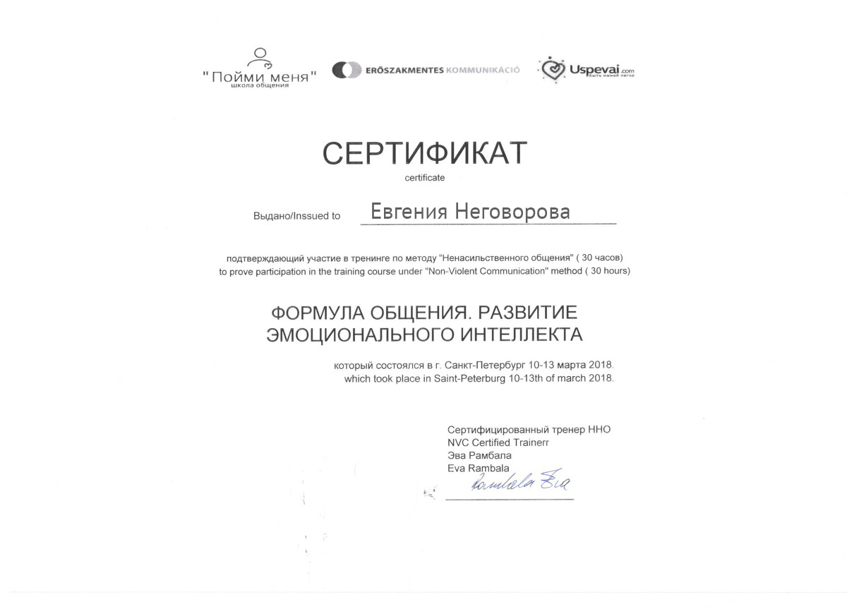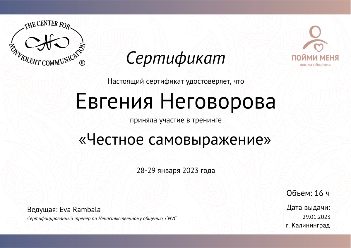 - Сертифицированный тренер по Ненасильственному общению, CNVC;