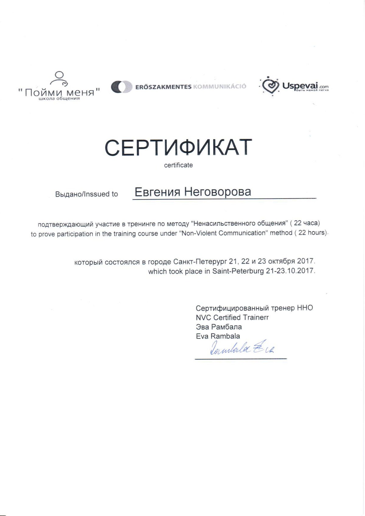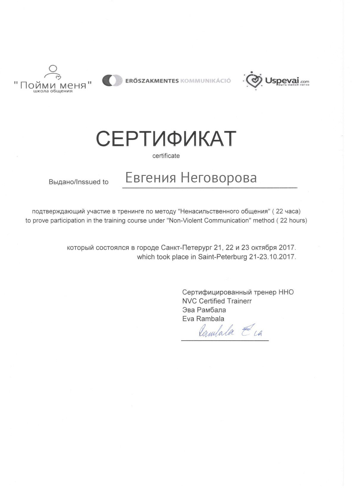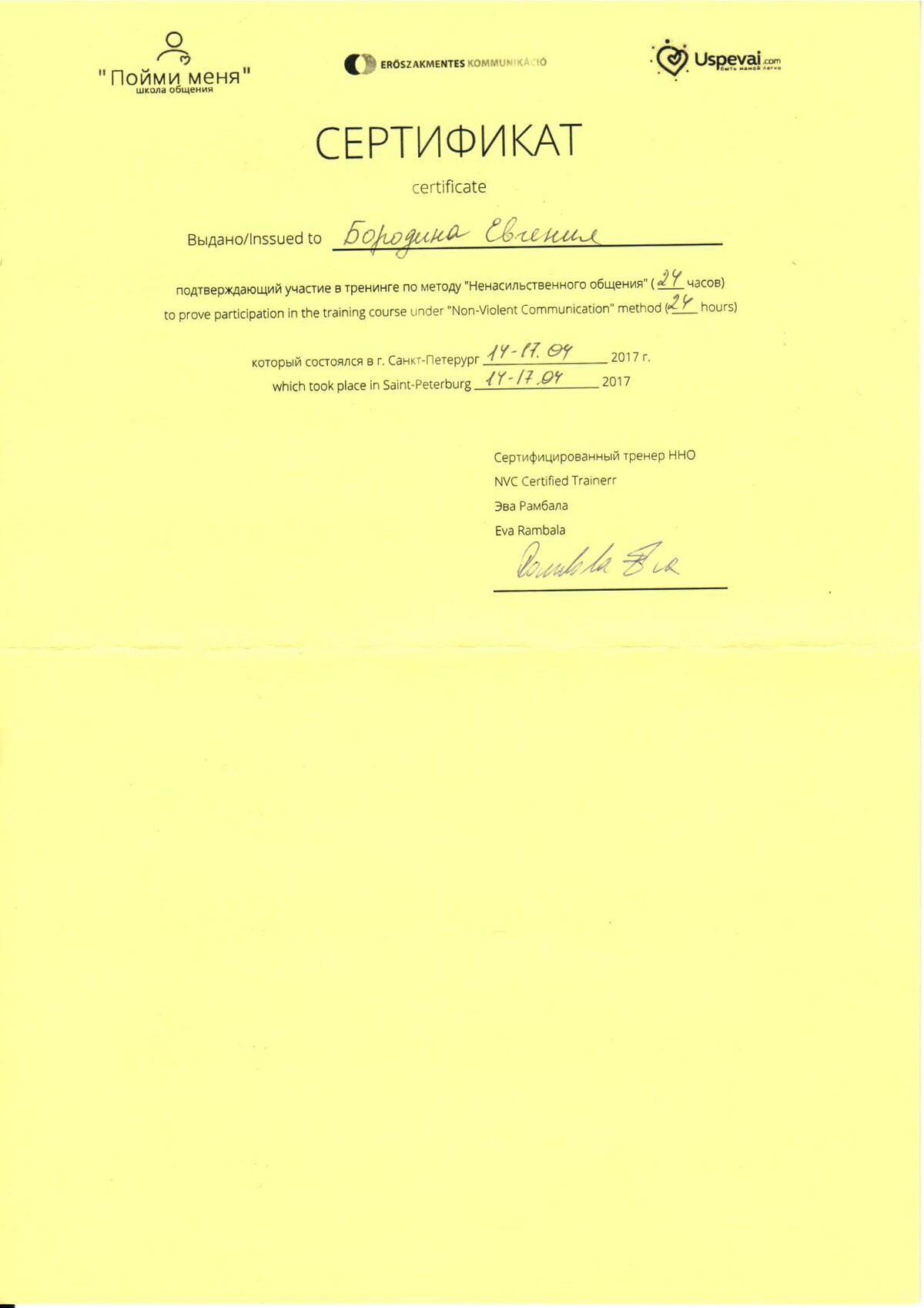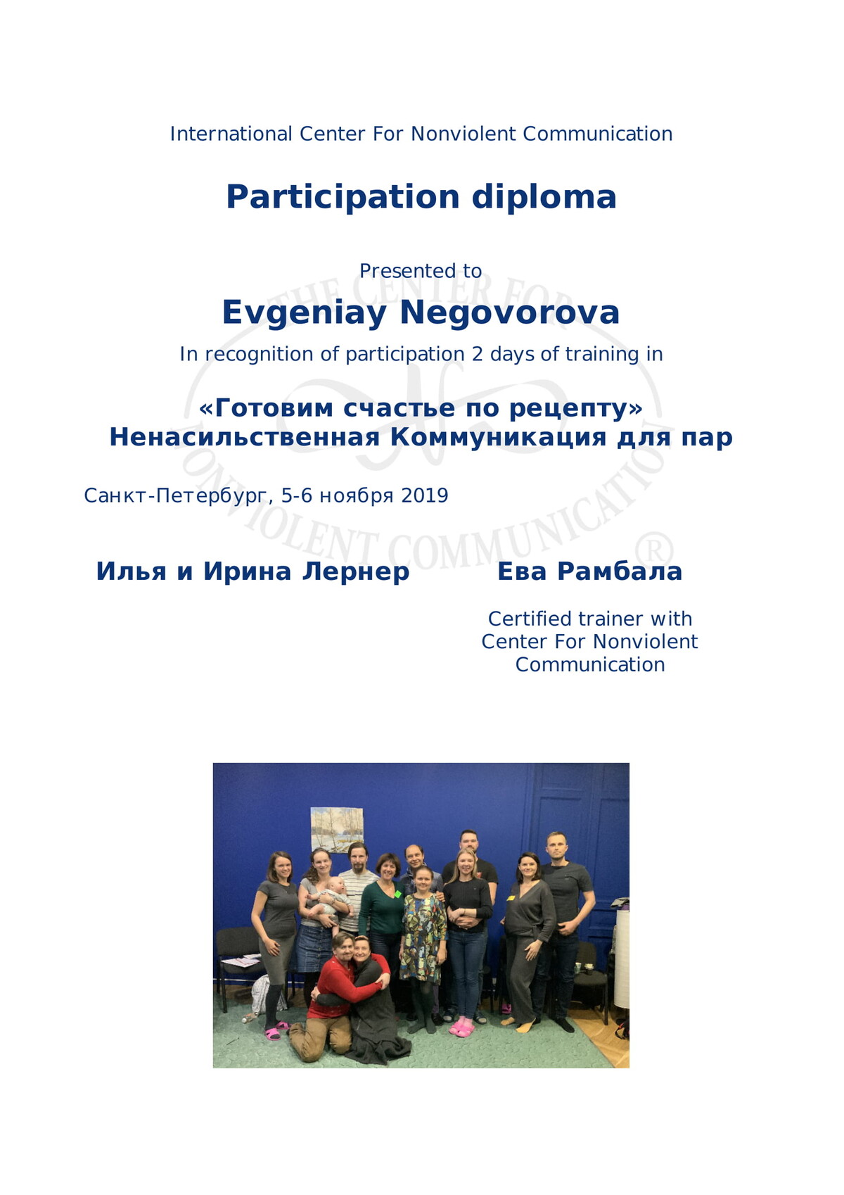 - Сертифицированный тренер по Ненасильственному общению, CNVC;