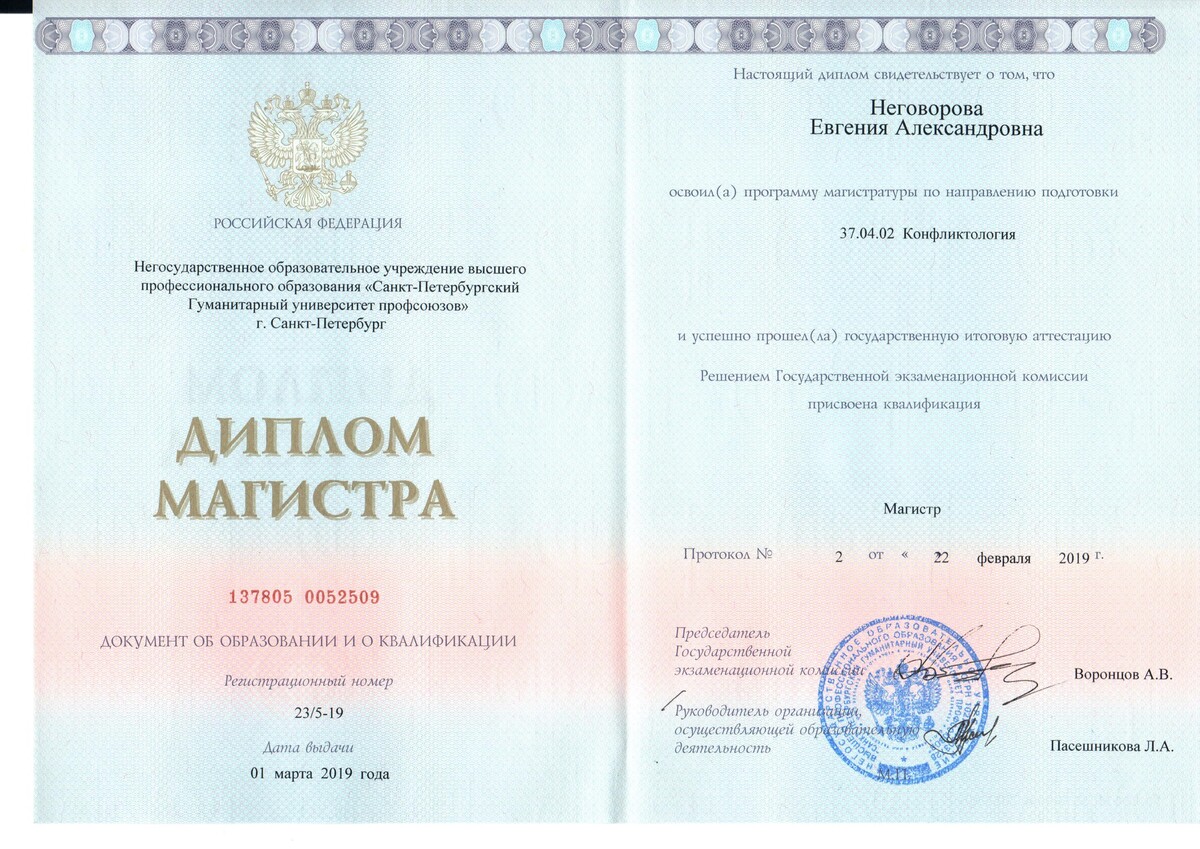 - Магистр конфликтологии (СПБГУП);