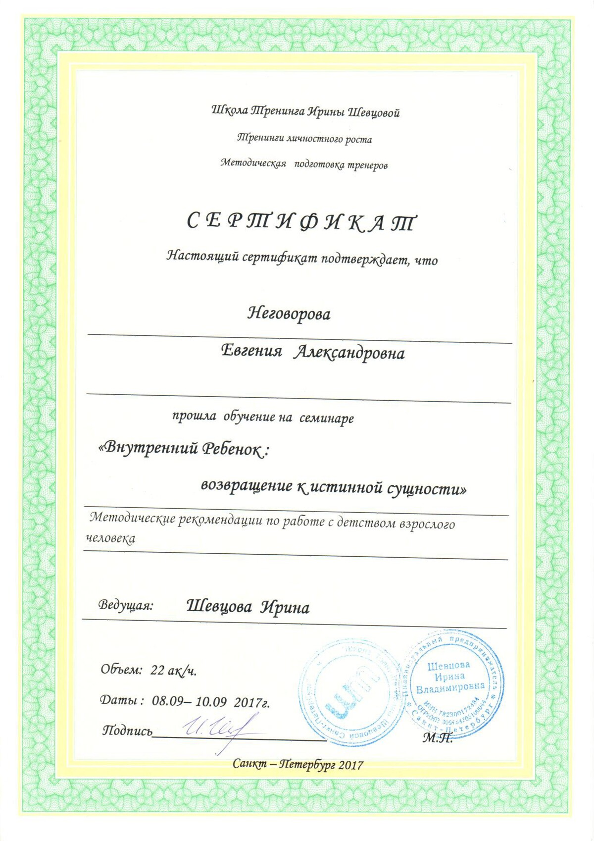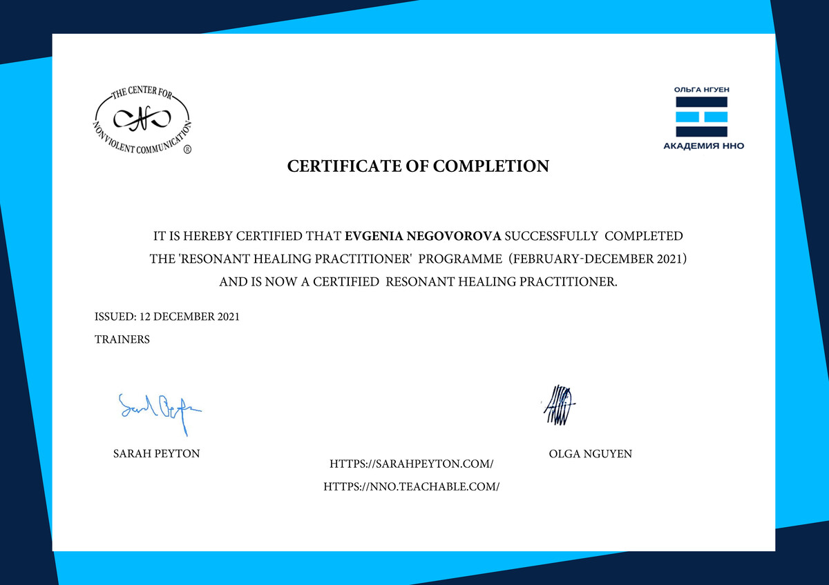 - Сертифицированный практик Резонансной поддержки (Sarah Peyton);
