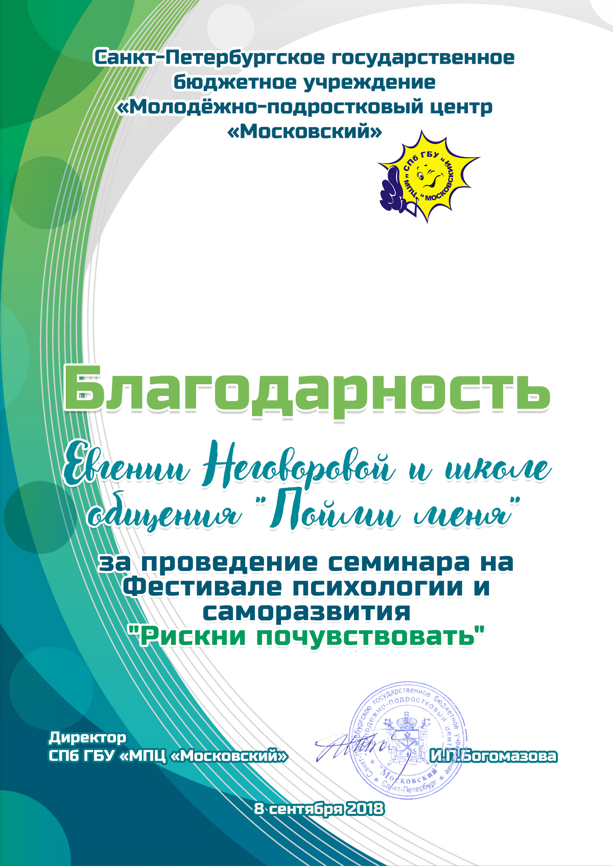- Со-основатель школы общения «Пойми меня» — обладателя премии Семейного образования в номинации «Лучший проект для родителей» — 2017;